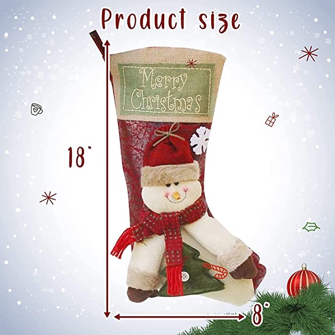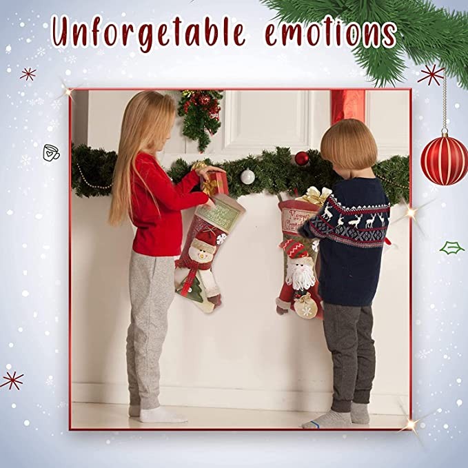 This pack of Christmas stockings for hanging will look perfect in front of your fireplace, Christmas tree and kids bedroom during this holiday season The Xmas stocking gift bag for Christmas fireplace decorations has a large top opening that is perfect for: - candy of all kinds - small gifts - stocking stuffers Christmas decorations for home clearance with a sturdy hanging loop will perfectly decorate: - fireplaces - mantel - stair case - Christmas tree - the end of the bed The holiday stockings to decorate the parties are also suitable for: - schools - classrooms - clubs - offices - restaurants - hotels - barsThe package includes: Christmas house decor stockings 3 pcs You can make the exquisite presents to your friends, classmates or relatives and put them into the rustic Christmas stockings