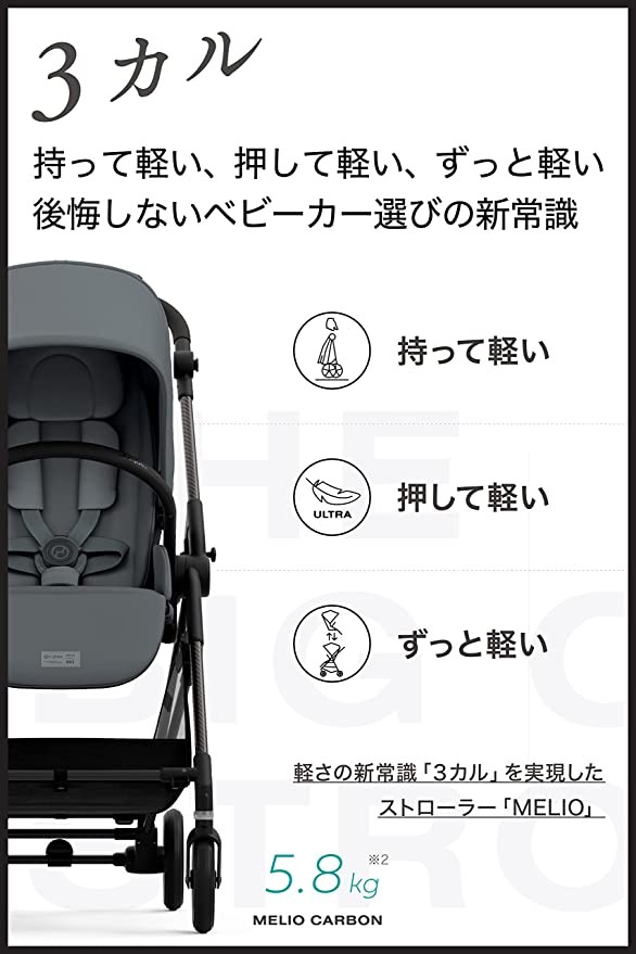 [Easy to carry] Its weight is only 5.8 kg (MELIO CARBON), which is very outstanding in the history of CYBEX brand. It's so light that it can be folded and taken with you, even when going up and down stairs. It can also be easily tucked into a car.