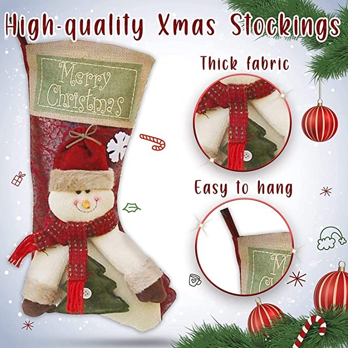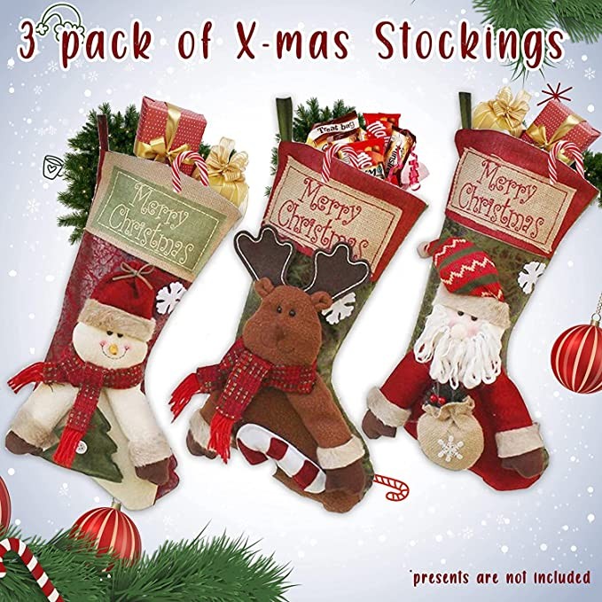 This pack of Christmas stockings for hanging will look perfect in front of your fireplace, Christmas tree and kids bedroom during this holiday season The Xmas stocking gift bag for Christmas fireplace decorations has a large top opening that is perfect for: - candy of all kinds - small gifts - stocking stuffers Christmas decorations for home clearance with a sturdy hanging loop will perfectly decorate: - fireplaces - mantel - stair case - Christmas tree - the end of the bed The holiday stockings to decorate the parties are also suitable for: - schools - classrooms - clubs - offices - restaurants - hotels - barsThe package includes: Christmas house decor stockings 3 pcs You can make the exquisite presents to your friends, classmates or relatives and put them into the rustic Christmas stockings