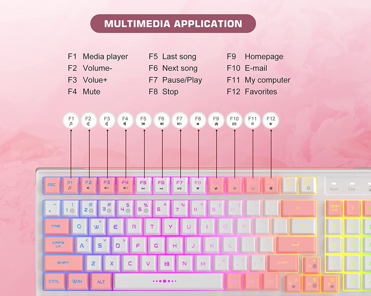 • RGB lighting effect and waterproof design The keyboard has built-in cool RGB backlight effect, supports 5 light switching modes, adjusts different brightness levels and light moving speed, you can choose according to your needs. The keyboard surface has a certain waterproof function to protect yours. (Note: Do not immerse in water directly)