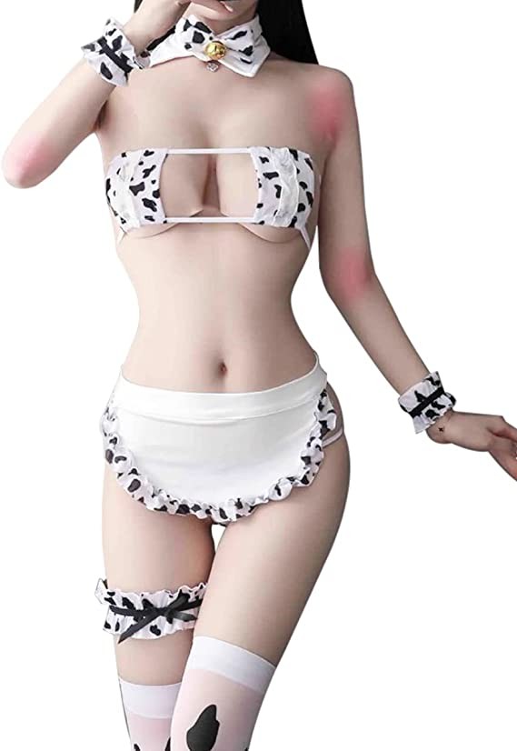 Ailookbuy Women Anime Cow Cosplay Bikini Lolita Cute Lingerie Bra And Panty Set With Stockings