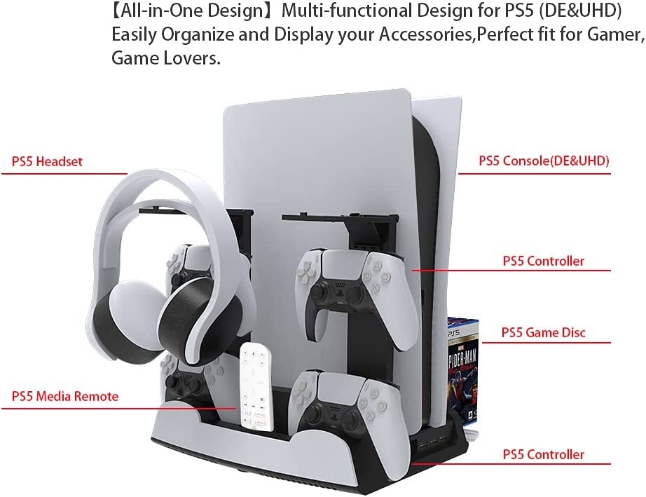 • [Superior Space Management] The PS5 Vertical Stand keeps our home space tidy and space-saving, with 2 charging docks, 13 gaming slots, a media remote stand and 2 gaming headset stands.