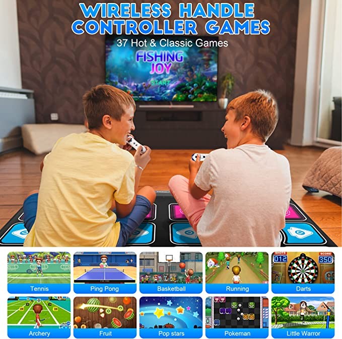 • Dual Wireless Game Controller: 2.4G wireless controller provides you the best gaming experience. The wireless range of the controller is enough for a living room or playroom. It's easier to play games. No wires, mess or hassle, open the controller handle (requires 2 AAA batteries) and start gaming! (Note: If you are not satisfied with this dance mat or have any other questions, please feel free to contact us before returning it. We promise to provide you with a satisfactory solution.)