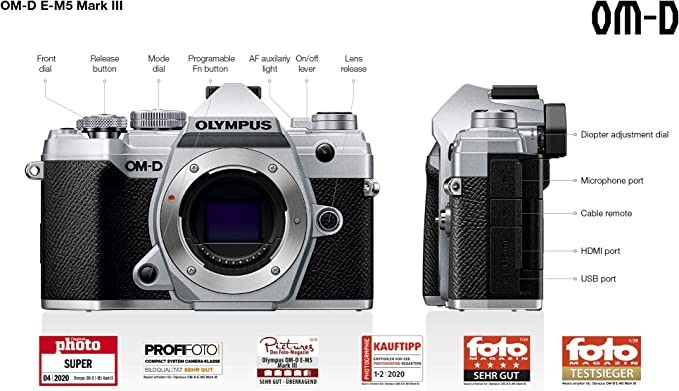 OLYMPUS Olympus OM-D E-M5 Mark III miniature 3/4 system camera body, 20 MP sensor, 5-axis image stabilizer, powerful autofocus, electronic OLED viewfinder, 4K video, WLAN, Bluetooth, silver