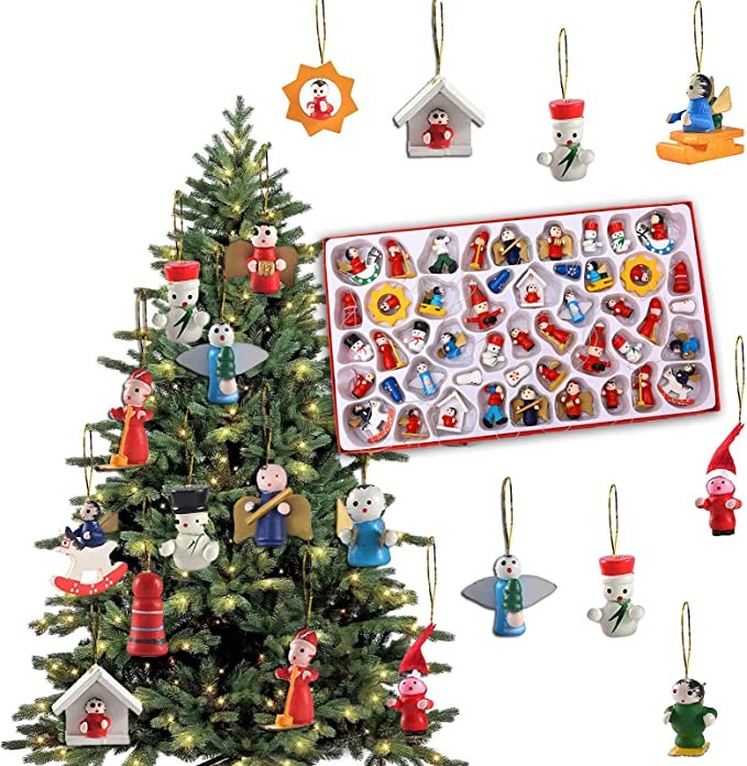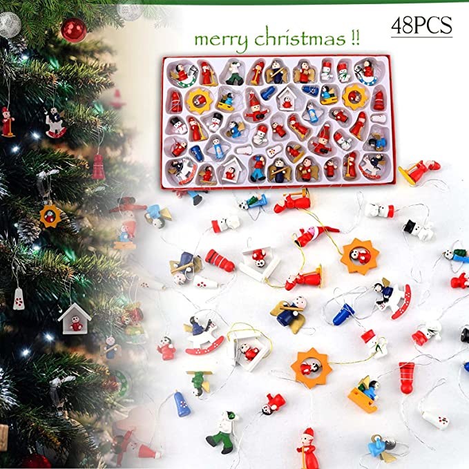 Christmas Wooden Ornament 48Pcs Wooden Hanging Decorating Set for Christmas Mini Wooden Christmas Tree Home Decorations Snow Tree Bell Horse Shape Christmas Hanging Ornaments Kit for Christmas Decorations Christmas Wooden Ornaments Kit: Comes with a Wooden Storage Box and 48 Hanging Ropes. Box includes 48 different shapes which are cute Christmas doll, garland, snowman and Santa.Great for hanging on your Christmas tree, wall, door, window or fireplace decorations.Durable Material: These ornaments are made of natural wood, lightweight and durable. Each Christmas Wood Ornament is conformed to Christmas theme. The fashion and cute Christmas design, making the happiness and joy to your families to celebrate the Christmas.Hand Crafted: Each mini wooden Christmas tree ornament is delicately and intricately crafted with extreme care to ensure fine detail. Enjoy a variety of styles including Santa Claus, Snowman & Angels! The Perfect Christmas tree decorations for 2020 including mini ornaments in white blue black red gold.Vintage Style: We set out to create the cutest sentimental mini christmas tree ornaments that combine a vintage old fashioned farmhouse style that brings you back in time to the simple holidays with friends and family.Multi Useage/ Best Gift: Create your own fairy garden and dollhouse with these small miniature ornaments, suitable for DIY decoration of mini garden views, mini landscaping, dollhouse and plant decoration.Great for birthday goodie bags, giveaways, incentives for students, ornaments for party.